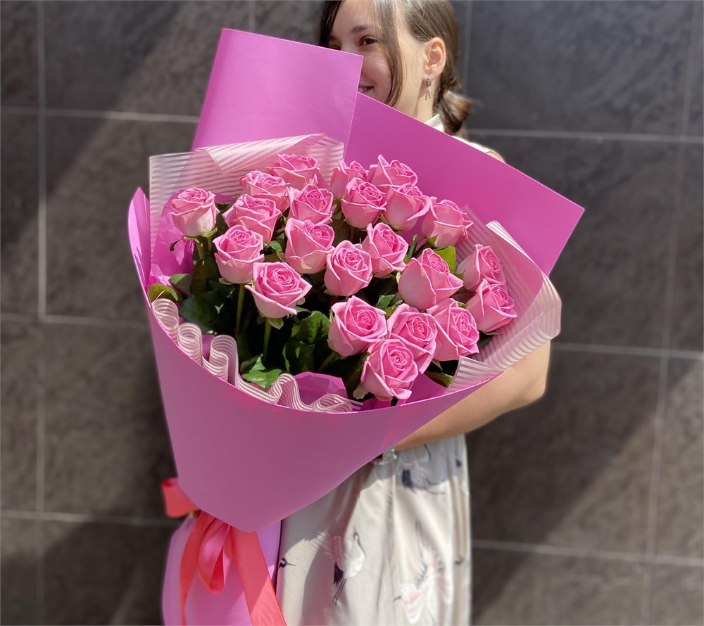 25 розовых роз микс 50см
