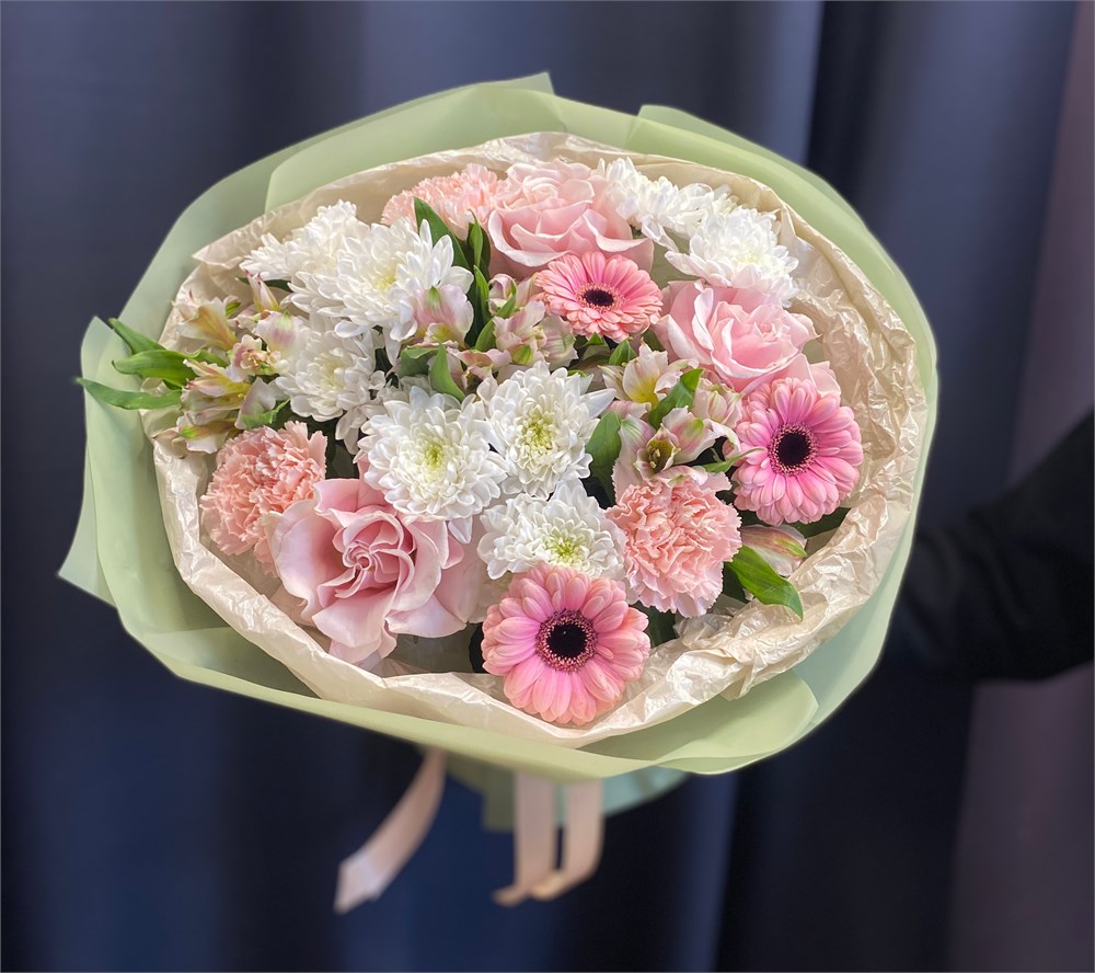 №38 Букет из нежных роз, гермини, диантусов и альстромерии