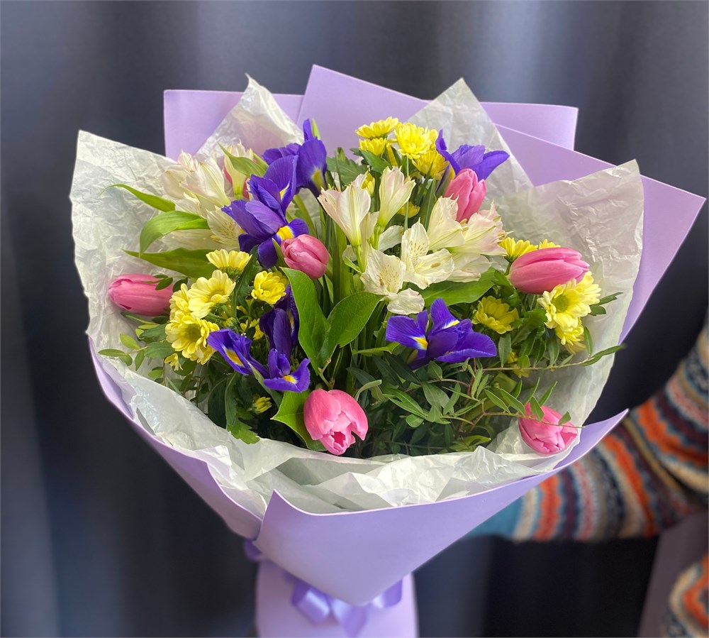 Букет из альстромерий, ирисов, тюльпанов и сантини