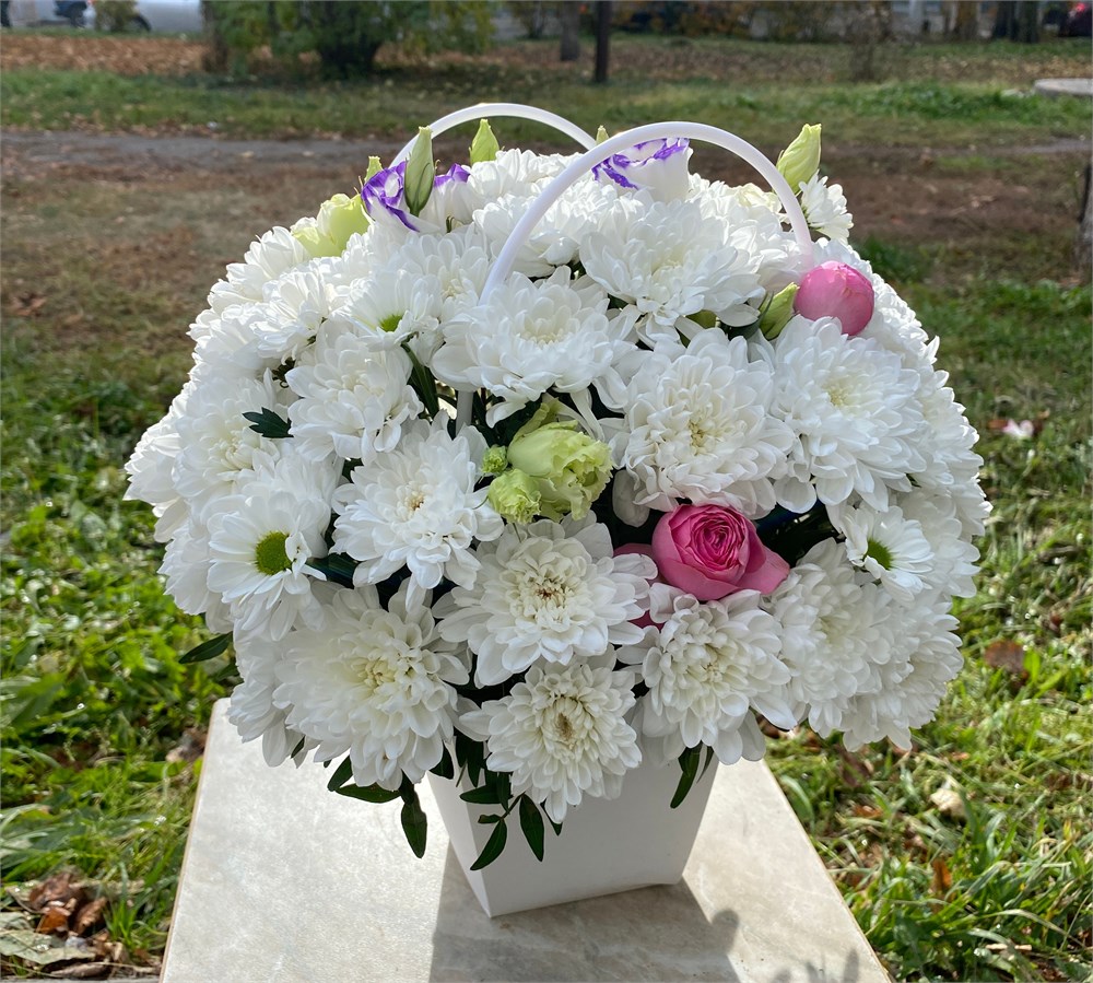 Состав: Хризантема кустовая - 6шт. Роза кустовая – 1шт. Эустома – 1шт. Оазис Сумочка